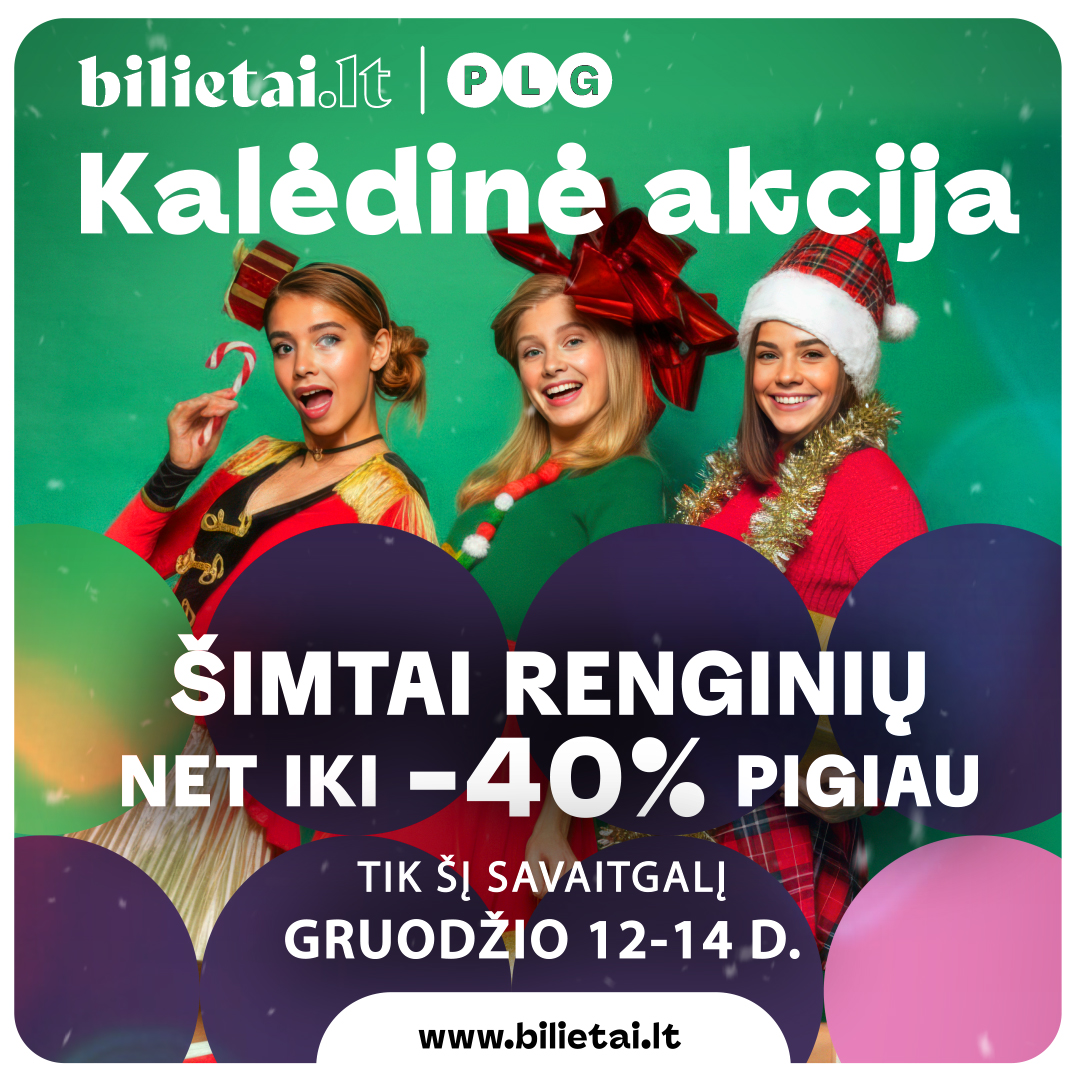 Artėjant didžiosioms metų šventėms, „Bilietai.lt“ pristato Kalėdinę akciją, kuri tris dienas suteiks galimybę įsigyti bilietus į šimtus renginių patrauklesnėmis kainomis. Gruodžio 12–14 dienomis lankytojai galės rinktis iš itin plačios pasiūlos – nuo koncertų ir teatro spektaklių iki edukacijų, šeimos renginių ir festivalių. Tai puikus metas pasirūpinti dovanomis, suplanuoti šventinius vakarus ir nustebinti artimuosius įspūdžiais, kurie išlieka ilgam.