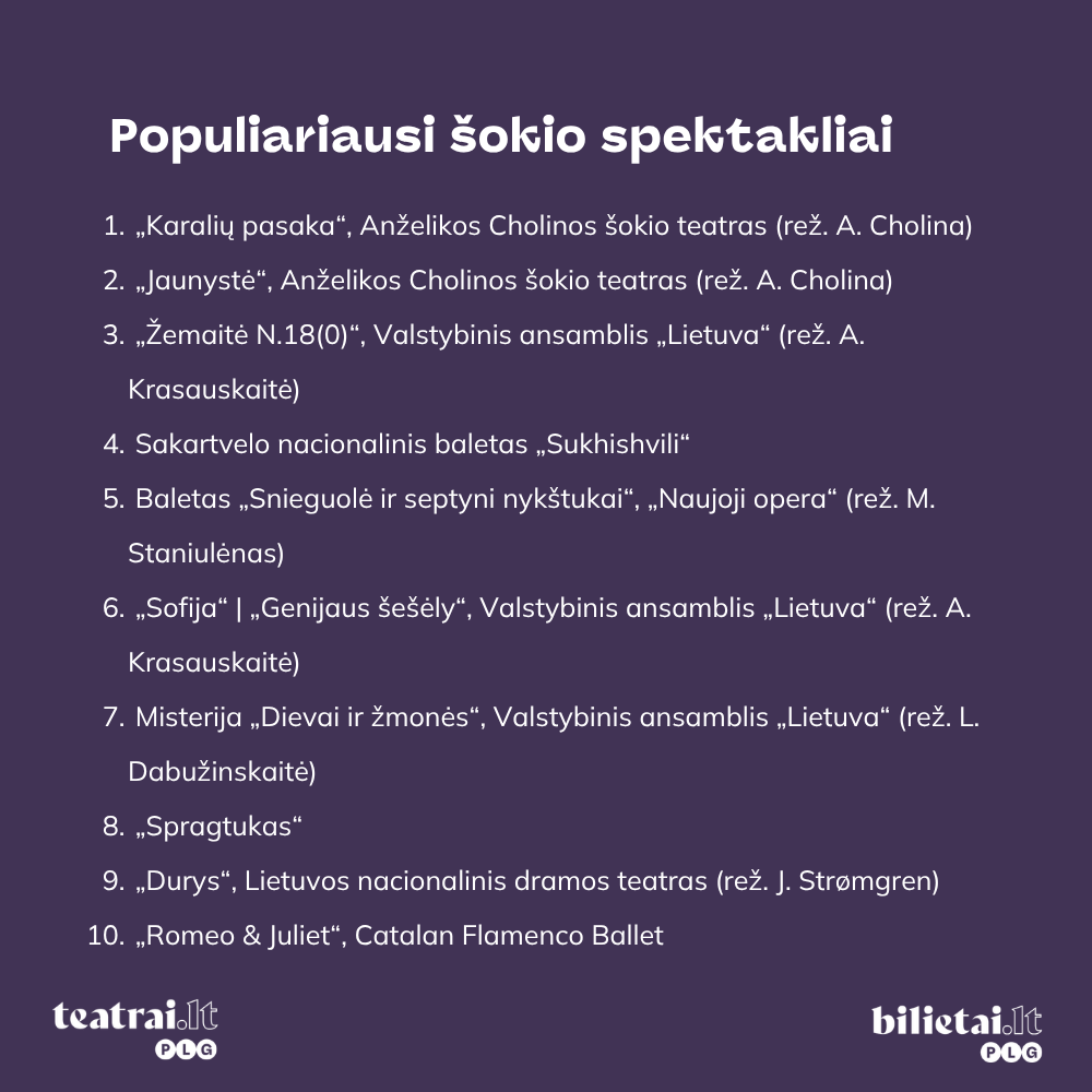 Anželikos Cholinos šokio teatras tęsia savo 26-ąjį sezoną visoje Lietuvoje. Anželikos Cholinos šokio teatras kviečia susipažinti su naujausiu kūriniu – įspūdingu, poetišku spektakliu „Karalių pasaka“, sukurtu pagal Mikalojaus Konstantino Čiurlionio ir kitų lietuvių kompozitorių muziką. Tai – epinė šokio poema, kviečianti pažvelgti į genialaus menininko gyvenimą ir kūrybą naujai, jautriai ir vizualiai turtingai.Geriausių XXI a. pasaulio kūrinių sąraše – opera-performansas „Saulė ir jūra“