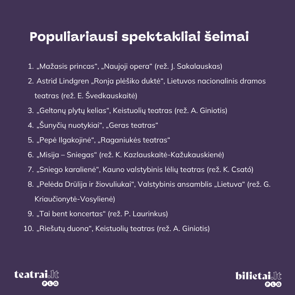 Mažiesiems žiūrovams ir šeimoms skirtame repertuare išsiskyrė „Mažasis princas“, „Ronja plėšiko duktė“ bei „Geltonų plytų kelias“, o tarp komedijų populiarumo viršūnėje atsidūrė tokie spektakliai kaip „Atiduodu žmoną“, „Pereinamasis miegamasis“ ar „Viskas užimta“. Tuo tarpu šokio ir judesio spektaklių kategorijoje žiūrovų dėmesį traukė Anželikos Cholinos darbai „Karalių pasaka“ ir „Jaunystė“, taip pat klasikiniai pastatymai, tokie kaip „Spragtukas“.