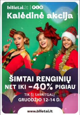 Pn 2025-12-12 „Bilietai.lt“ Kalėdinė akcija: ypatingos nuolaidos tik gruodžio 12–14 dienomis Artėjant didžiosioms metų šventėms, „Bilietai.lt“ pristato Kalėdinę akciją, kuri tris dienas suteiks galimybę įsigyti bilietus į šimtus renginių patrauklesnėmis kainomis. Gruodžio 12–14 dienomis lankytojai galės rinktis iš itin plačios pasiūlos – nuo koncertų ir teatro spektaklių iki edukacijų, šeimos renginių ir festivalių. Skaityti daugiau